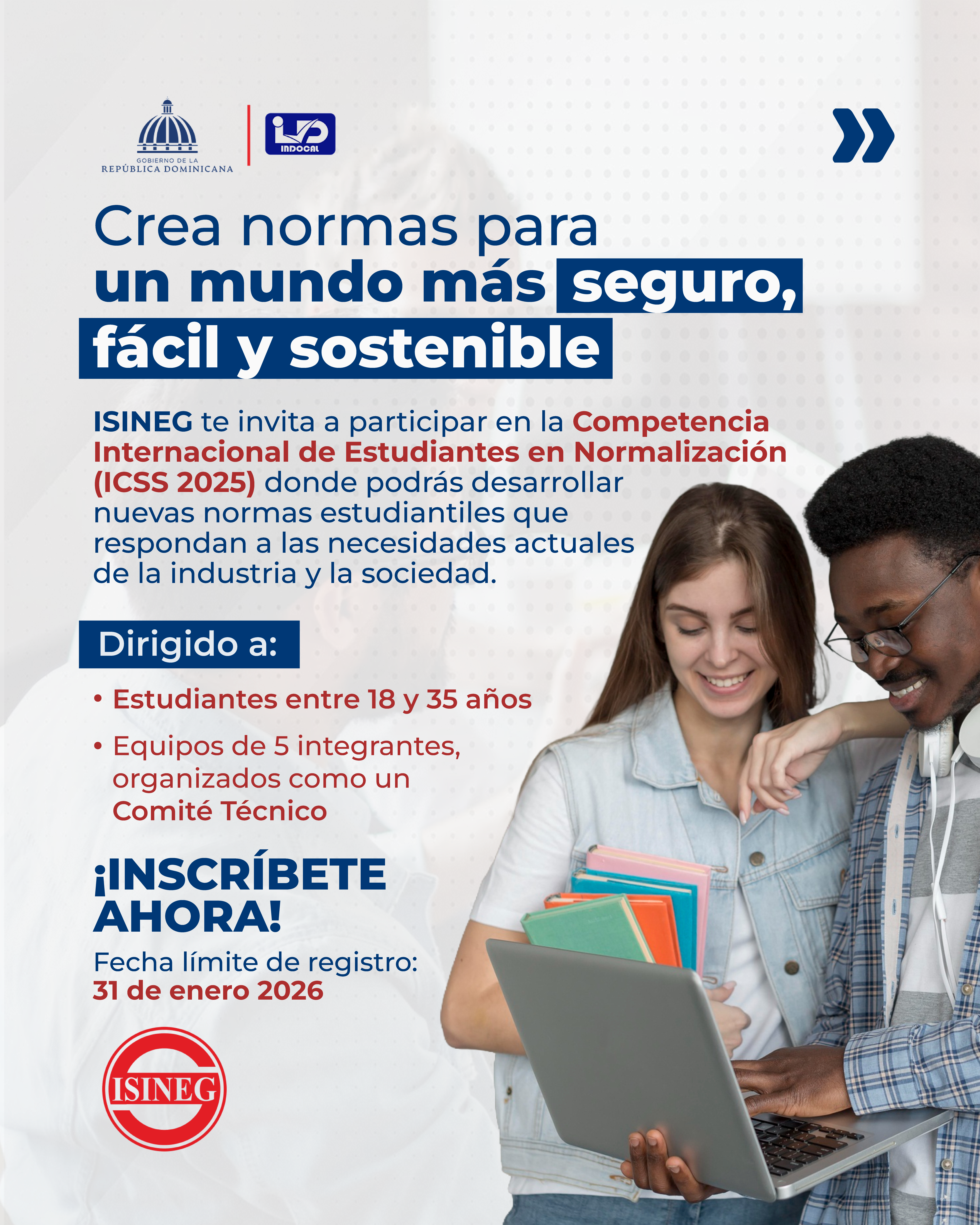La Competencia Internacional de Estudiantes en Normalización (ICSS 2025), organizada por ISINEG, invita a jóvenes entre 18 y 35 años a participar en el desarrollo de propuestas de normas que respondan a las necesidades actuales de la industria y la sociedad, promoviendo la innovación, la seguridad y la sostenibilidad.